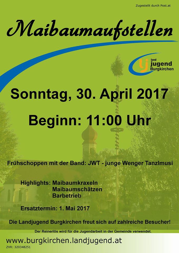 2 Jahre nach dem trotz Schlechtwetters sehr gut gelungenem Frühschoppen 2015 lädt die Landjugend Burgkirchen auch 2017 wieder zum Maibaumaufstellen am 30. April beim Zeughaus Burgkirchen ein! ;)